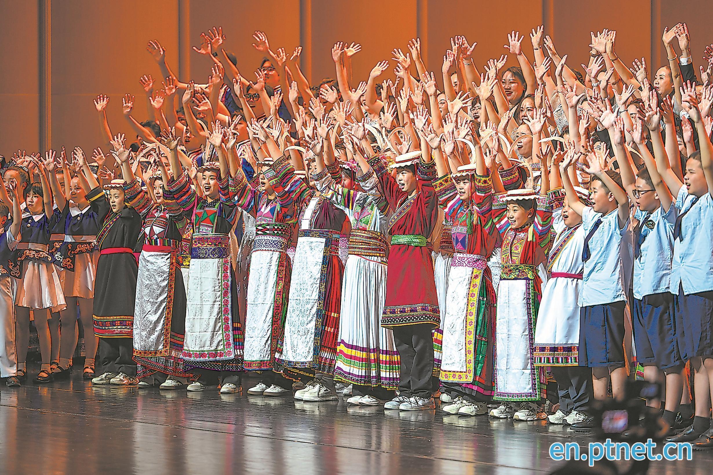 en.ptnet.cn | Updated:2025-09-17 | Lin Kongbo, StephanieThe Xiaohuajiao Children's Choir from Wen County, Gansu Province, takes the stage alongside five other choirs to perform the classic piece The Same Song. (Photographed by Lin Junbin)