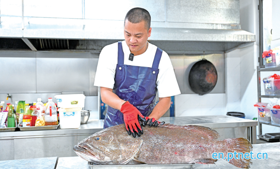 en.ptnet.cn | Updated:2025-09-18 | Lin Kongbo, StephanieShi Kunhua prepares to handle thegiant wild grouper.