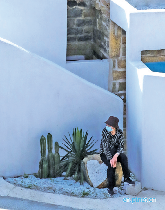A local villager rests on a "love seat" – a stone chair painted with a white heart – outside Moqiao Homestay. The homestay added these seats to make waiting for buses more comfortable for the community. (File Photo)