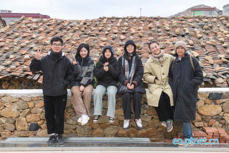 Members of the "Northern Life Qingfeng Art" team take a group photo in front of the stone houses in Qingfeng Village.