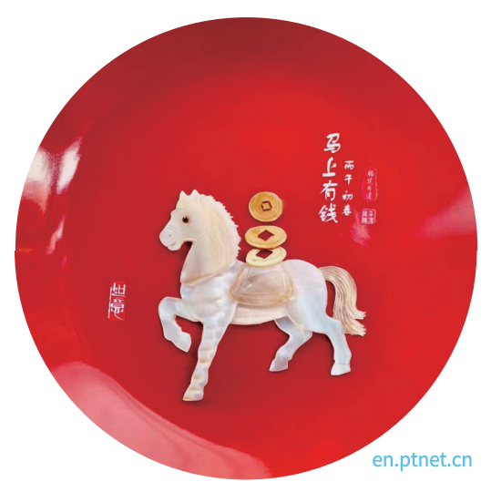Zhou Ming, an inheritor of Pingtan Shell Carving, has kept the tradition of designing Chinese zodiac-themed shell carving works every year. For the Year of the Horse, he created the May Fortune Come Soon series in two styles, a small red one and a large blue one, to cater for different occasions. The nine-centimeter small piece features a red base with a steed carved from white pearl shell and three ancient coins made of golden butterfly shell on the horse's back. "Red symbolizes a prosperous start, and the gentle texture of shells implies the steady accumulation of wealth," Zhou said. The 27-centimeter large piece has a deep blue base, with a natural abalone shell with iridescent colors inlaid on the saddle, adding an elegant luster to the work. Another work, a custom-made piece titled May Success Stride Swiftly, is currently in the works. Inspired by Xu Beihong's iconic galloping horse paintings, it symbolizes a thriving career. The shell carving works are well-received by the market; the blue version of May Fortune Come Soon has sold out, and the red one is being rushed to production.
