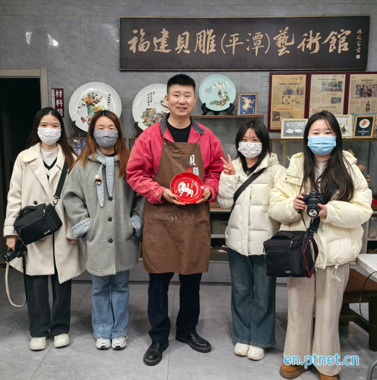 Zhou Ming(centre) presenting horse-themed shell carving work