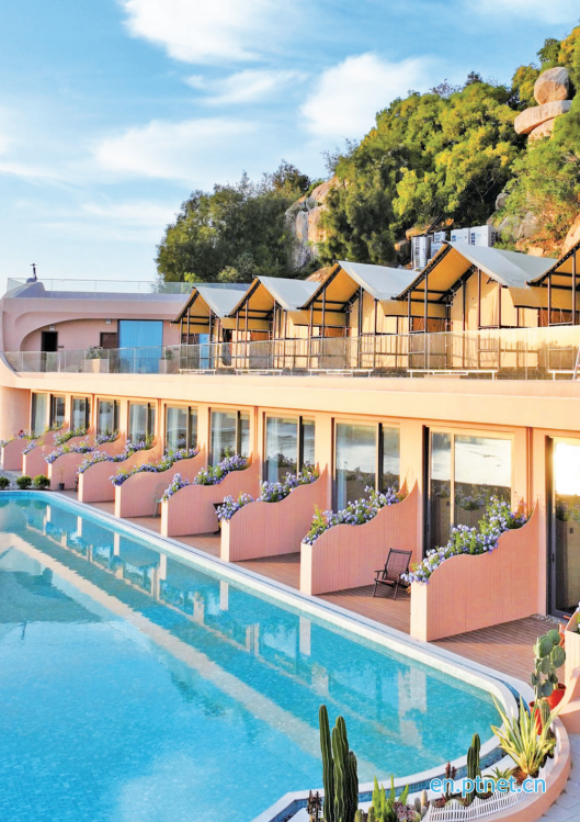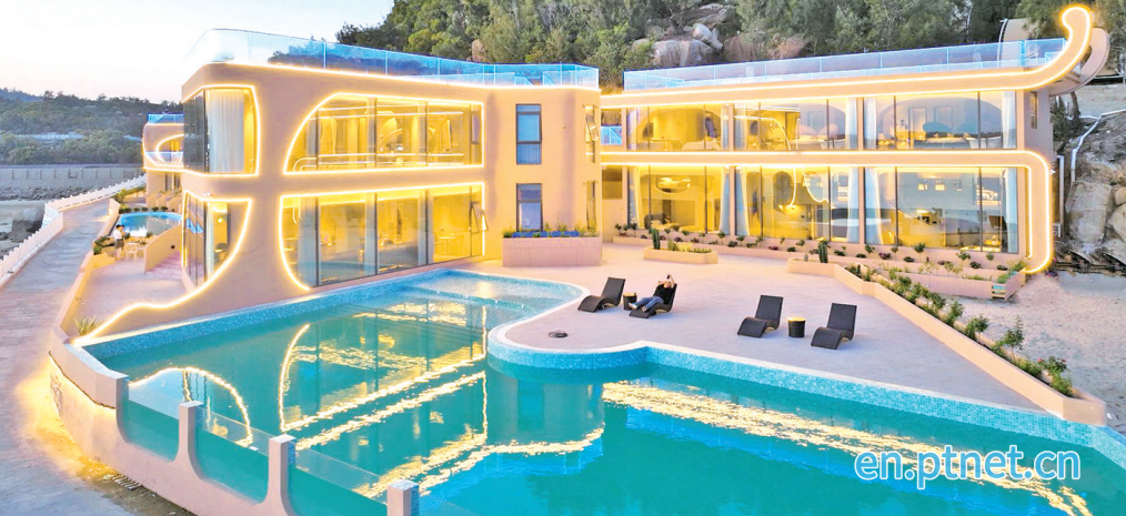 Ding Qin, the homestay's manager and a post-80s Pingtan native, left her hometown to make a living at 18 and returned in 2023 with a dream of love. The nearly 20-mu homestay complex shaped like a cruise ship is filled with romantic details. The 33.44-meter flower path symbolizes eternal love, and the 13.14-meter zipper-shaped decoration hints at a brighter future. The buildings each have their own character: Building 1 features a half-male, half-female sculpture on its wall; Building 2 rests like a fetus within a heart-shaped swimming pool; and Building 5 houses a 3D-printed ring-shaped bar, a tribute to love.