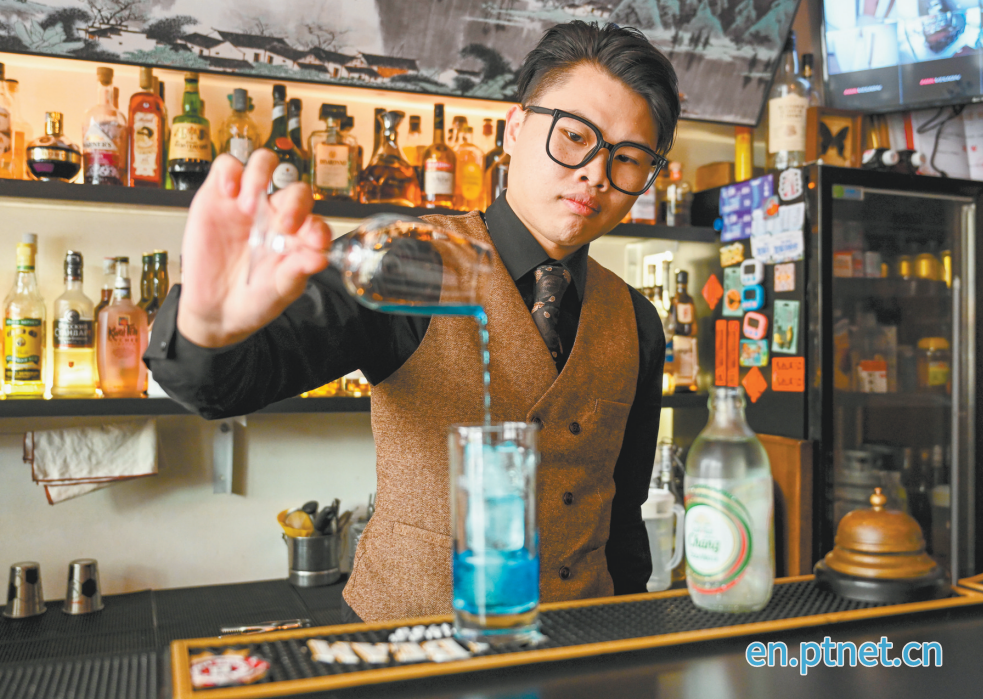 Zheng Zhizhong, owner of Weixun Highway Bar, is making the blue tears cocktail.