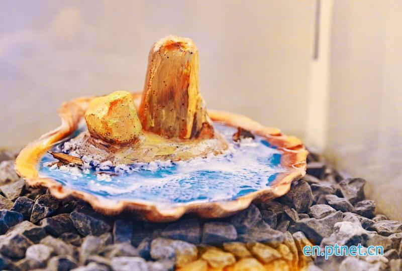 Making the Blue Tears miniature landscape is a sophisticated craft. It begins with carefully selecting thick seashells for the base, then using resin to make miniature versions of Pingtan's iconic landmarks like the Shipaiyang Rock Sails. The most demanding step is crafting the glowing Blue Tears waves: adding luminous pigment to resin and blowing gently into the resin as it begins to set in. "Blowing the shape is easy, but making it look beautiful takes experimentation. The materials are always unpredictable, a bit like opening a blind box," Yu Xi explained. This step defines the charm of the work, which takes a week to make as each layer of material needs time to fully set, so it is only available for pre-order.