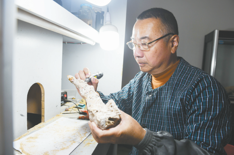 Shi Xiaobin makes a sea willow carving work.