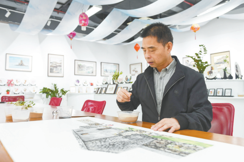 Pingtan Sand Painting blends traditional Chinese line drawing techniques and draws on the island's unique natural sea sand—the sand, with a quartz content of over 90 percent, shows various hues without artificial dyeing. Its creation involves meticulous procedures including material preparation, line drawing, gluing, sand spreading and fine tuning, resulting in layered, three-dimensional works that mostly feature Pingtan's stone houses and fishing port scenery. "Pingtan Sand Painting must reflect the essence of Pingtan, such as its mountains, seas and local sand," said Lin Fuping, an inheritor of Pingtan Sand Painting. He added that immersive experiences will be launched to let the audience see the whole creation process, and cooperation with education departments will be strengthened to bring the intangible cultural heritage into campuses.