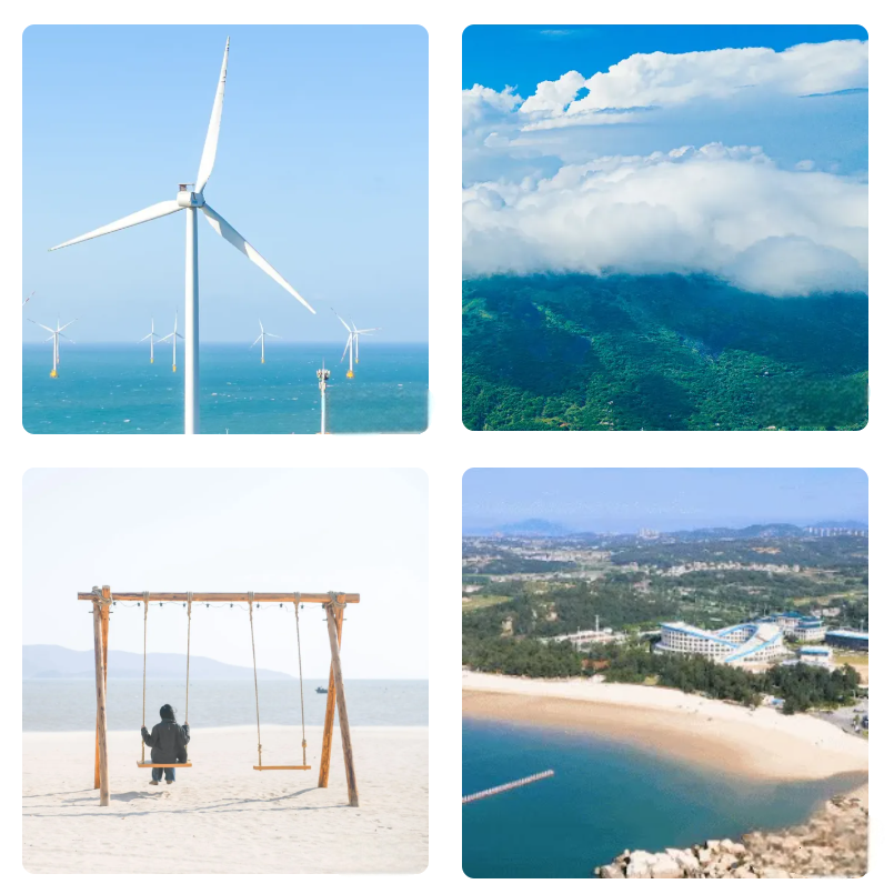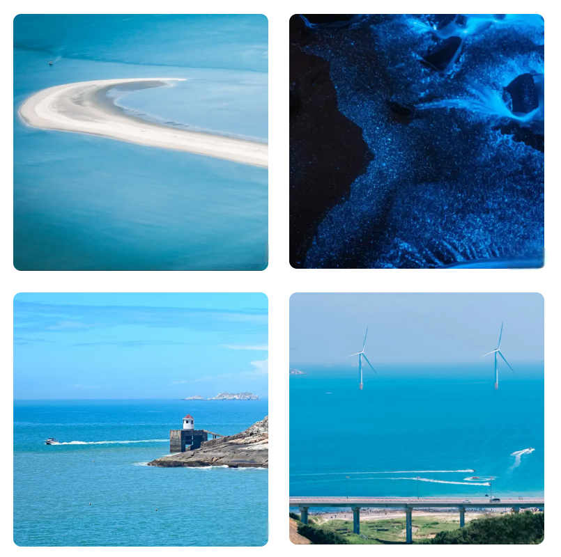 White-themed spots include the white wind turbines at the Northern Ecological Corridor, the misty cloud sea of Mount Junshan, and the pristine white sand beaches of Dongxianyang and Tannan Bay, known for their quiet and unspoiled beauty.