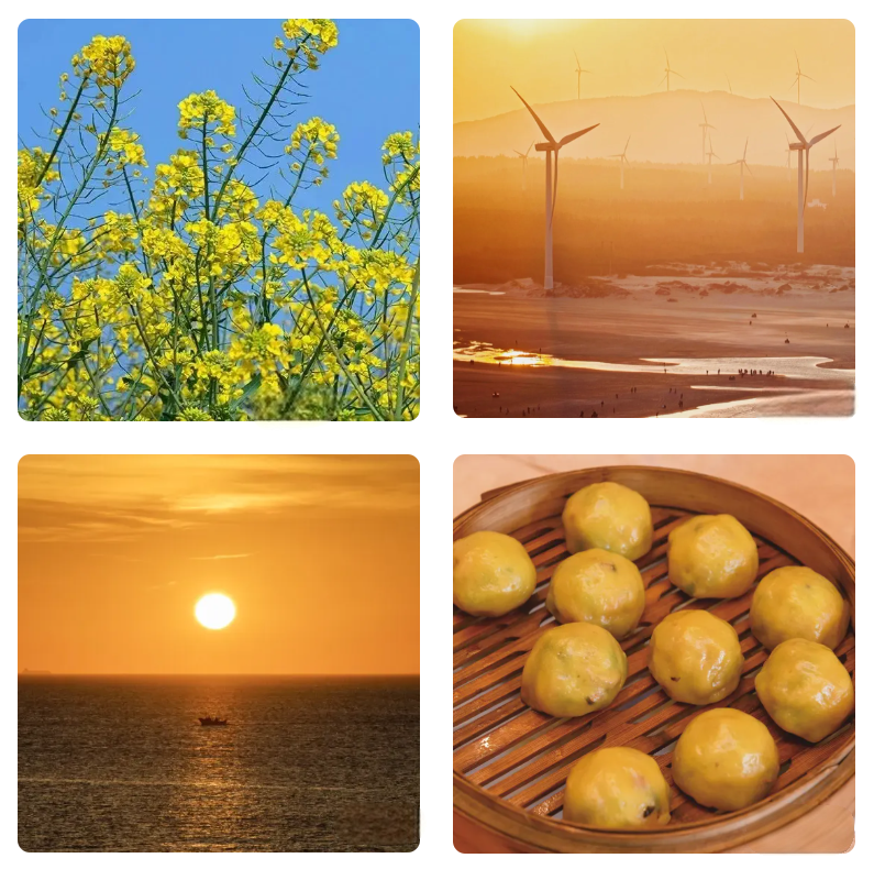 The golden yellow theme blends rural and coastal beauty, with the 30-mu rapeseed flower fields in Dongzhan Village, the golden sunset at Changjiang'ao, and the warm golden sunrise at Longwangtou Beach; local golden dumpling Shilaiyunzhuan (or Lucky Dumpling) is also a must-try for food lovers.