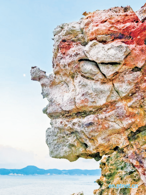 A peculiar rock stands by the sea, carved by thousands of years of sea winds and waves into a natural silhouette of a human face.